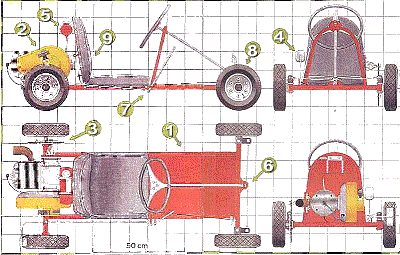 Ce qu'est un "go-kart"Il n'est pas inutile de rappeler qu'un "Go-kart" est un minuscule petit véhicule à quatre roues, d'une conception extrêmement simplifiée, mais qui permet de goûter aux mêmes joies qu'au volant d'une puissante voiture de sport. Quant au nom américain, nous l'avons conservé afin de maintenir l'unité en cas de rencontres internationales car, même en Belgique, on parle de "Go-kart", mot difficile à traduire...Voici l'essentiel de la réglementation officielle qui définit les caractéristiques du "Go-kart" : Comment l'acquérirIl existe pratiquement trois solutions pour se rendre propriétaire d'un "Go-kart".Comment l'utiliserAyant procédé nous-mêmes à des essais très complets avec un "Go-kart" américain, nous sommes en mesure de définir avec beaucoup de précision les modalités d'utilisation de cet engin.Le "Go-kart"A la demande de nombreux lecteurs, nous publions bien volontiers un plan cotés de véritable "Go-kart" à moteur McCulloch, fabriqué aux Etats-Unis. Il va sans dire que cet ensemble, fabriqué industriellement, est la propriété de la marque "Go-kart" et qu'il ne peut donner lieu à aucune fabrication commerciale en série. Les amateurs trouveront là, cependant, une documentation de premier ordre dont ils pourront s'inspirer directement et qui leur permettra, dans le cadre de la formule, de construire un véhicule dont la valeur est déjà reconnue en plusieurs pays Il suffit simplement de respecter les cotes indiquées par ailleurs. |