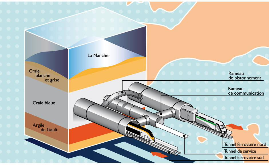 Autre difficulté : la ventilation. Dans le tunnel sous la Manche, l’air frais est envoyé dans la galerie de service qui se trouve donc légèrement en surpression. De quoi éviter, en cas d’incendie dans un des tunnels ferroviaires, que les fumées ne pénètrent dans le tunnel central dédié aux secours et à l’évacuation des personnes. Des galeries transversales, tous les 375 mètres, relient les trois tunnels, ainsi que des passages d’air, les « rameaux de pistonnement », tous les 250 m.