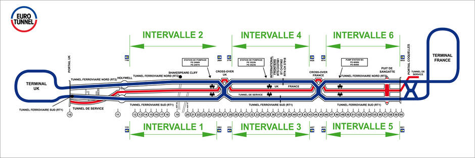 Schéma du tunnel avec ses deux cross-over qui permettent aux trains de changer